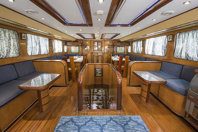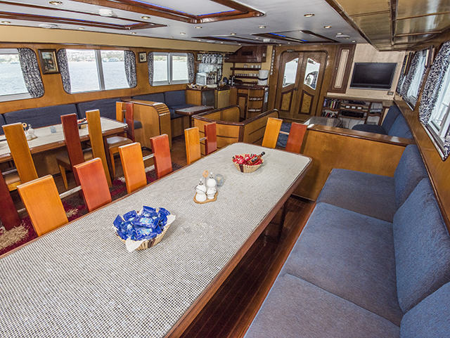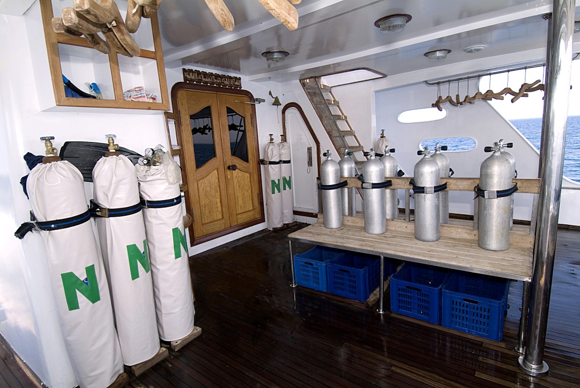 Сидения для дайверов расположены вдоль стен на нижней тиковой палубе, заход в воду удобен из-за отсутствия дополнительных ступенек.