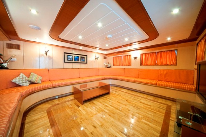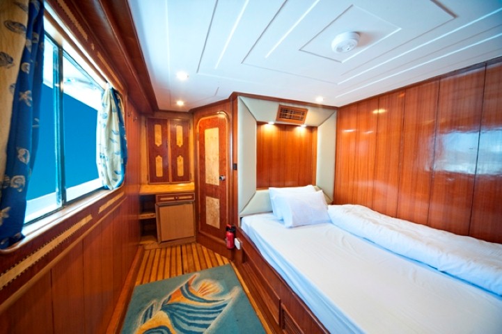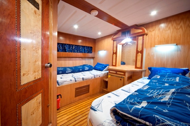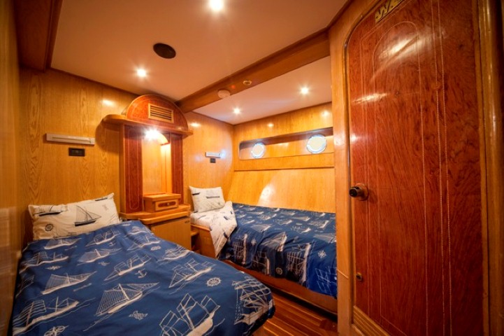 На яхте 10 двухместных кают. 8 кают с кроватями, расположенными отдельно на одном уровне, находятся на нижней палубе. 2 каюты с двуспальной кроватью — на верхней палубе. В каждой каюте ванная комната (туалет, душ - холодная и горячая вода), кондиционер, система распространения свежего воздуха, телевизор, аудиосистема.