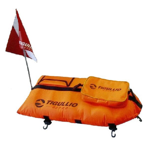 Буй Tigullio Apnea с чехлом. В верхней части буя расположен карман на липучке для мелочей и аксессуаров, а также съемный карман на липучке, который с помощью стропы можно использовать как сумку. В нижней части находится 6 пластиковых D-колец, 5 шарнирных карабинов, 3 ремня-держателя, 2 пары строп на липучках для крепления двух ружей. Буй оснащен ручкой для переноски. В комплекте: флаг 28,5x22 см на флагштоке, гермочехол 24,5х17,5 см.