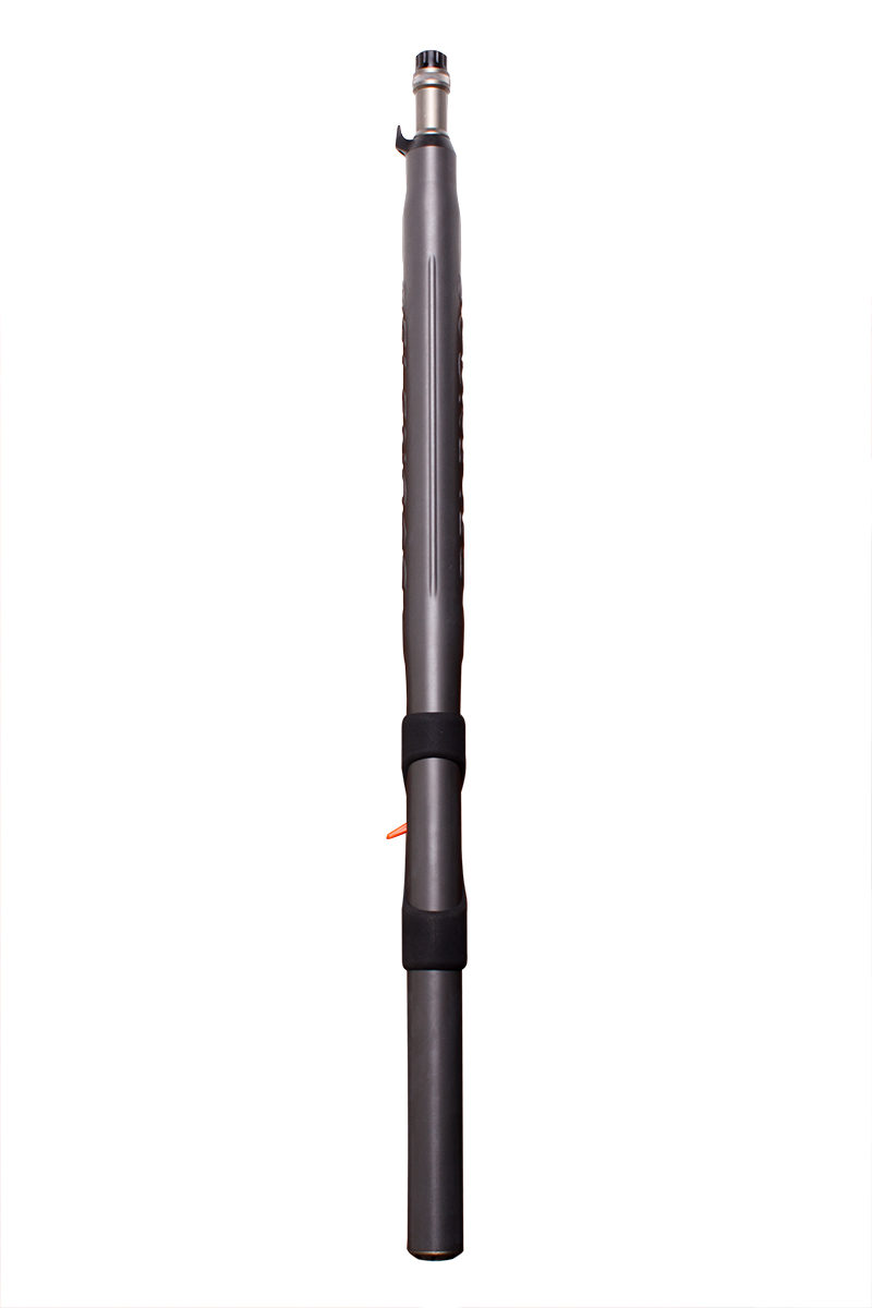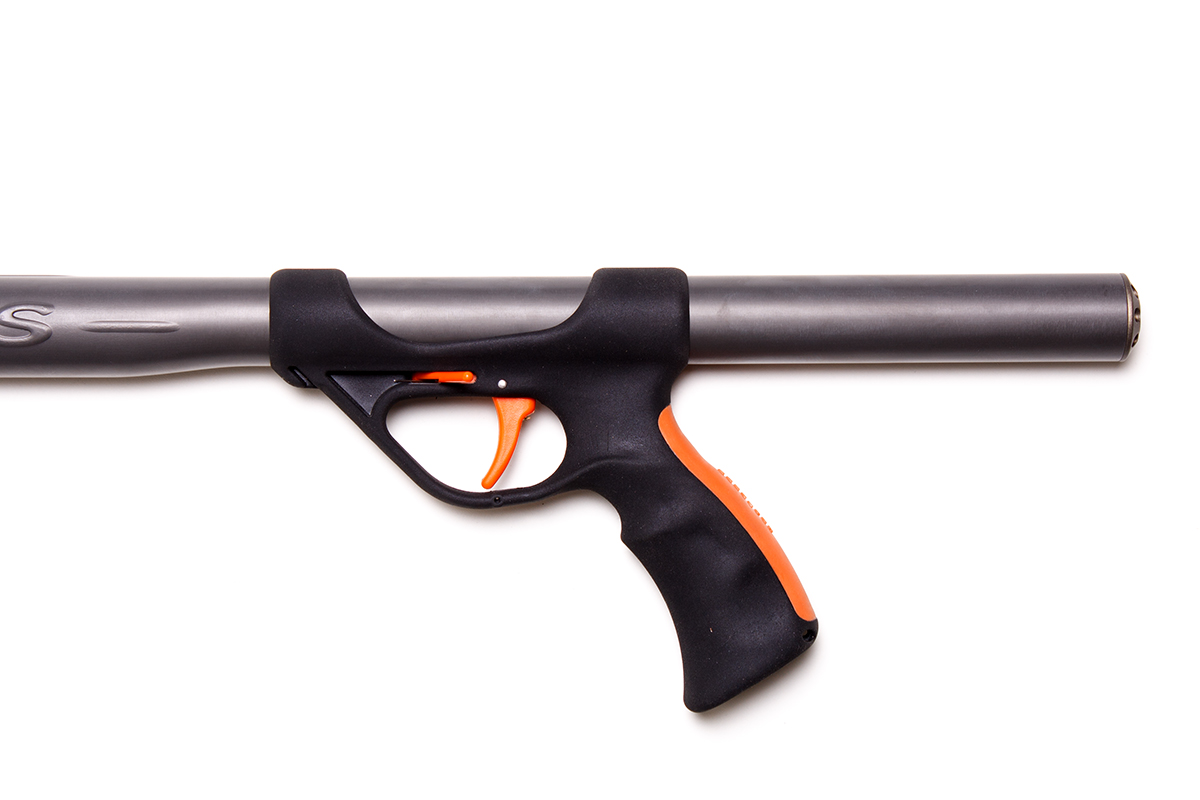 2. Удобная рукоять, с большим отверстием под указательный палец. Также на нее нанесено специальное покрытие от проскальзования с резиновой ярко-оранжевой накладкой с тыльной стороны, для удобства удержания. Внутри рукояти имеется герметичная полость, повышающая общую плавучесть ружья, а также предотвращающая эффект холодной рукояти. Отверстие в нижней части рукоятки для возможности крепления страховочного резинового кольца