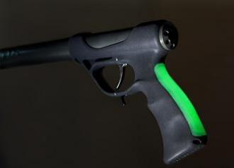 2. Удобная рукоять, с большим отверстием под указательный палец. Также на нее нанесено специальное покрытие от проскальзования с резиновой ярко-оранжевой накладкой с тыльной стороны, для удобства удержания. Внутри рукояти имеется герметичная полость, повышающая общую плавучесть ружья, а также предотвращающая эффект холодной рукояти. Отверстие в нижней части рукоятки для возможности крепления страховочного резинового кольца